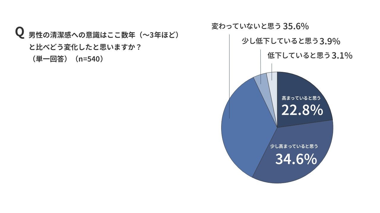 次に、「3年前と比較して男性の清潔感への意識はどう変化したと思うか」を聞いたところ、「高まっていると思う」と「少し高まっていると思う」を合わせると57.4%となりました。