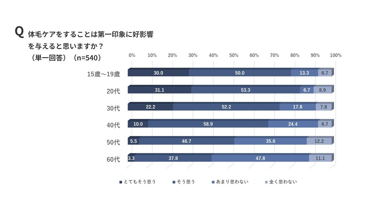 「体毛ケアをすることは第一印象に好影響を与えると思うか」を聞いたところ、6割以上(「とてもそう思う」と「そう思う」の合計66.8%)の人が良い影響を与えると思っていることがわかりました。特に10代から20代の男性は8割以上が好影響を与えると考えており、「体毛ケア」が第一印象に与える影響を重要視していることが分かります。