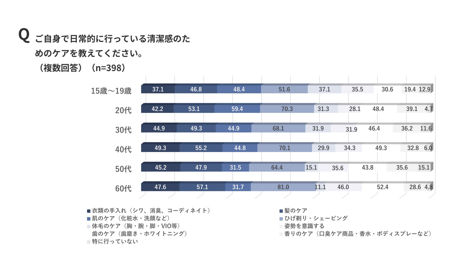 年代別に見ると、10代は「体毛のケア(胸・腕・脚・VIO等)」の割合が他の年代に比べて最も高い。体毛ケアが、「清潔感」を得るための行動として若年層を中心に浸透していることが明らかに。