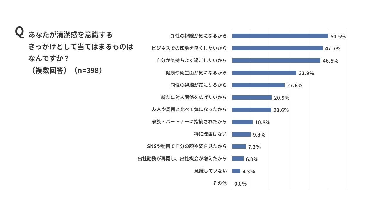 「清潔感」と回答した方に対して「清潔感を意識するきっかけ」を聞いたところ、最も多かったのは「異性からの視線が気になるから」(50.5%)となり、次に「ビジネスでの印象を良くしたい」(47.7%)が続きました。