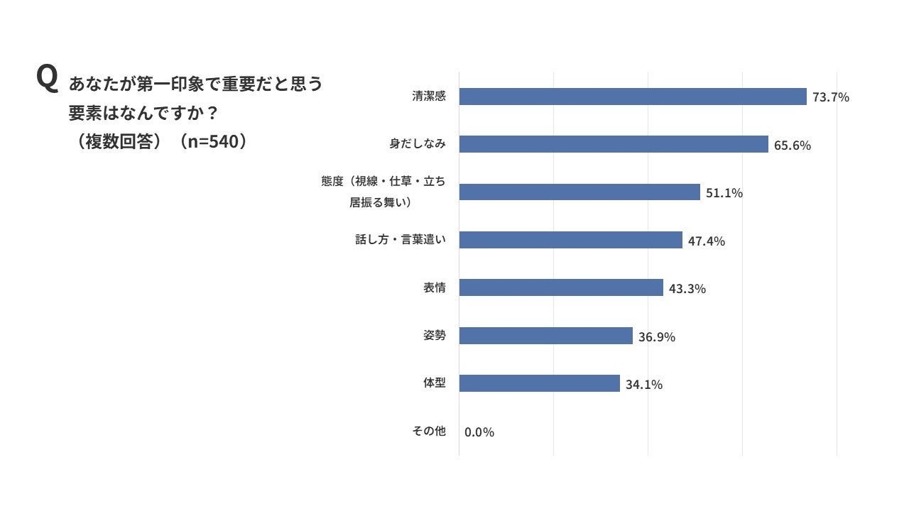 次に、「第一印象で重要だと思う要素」について聞いたところ、73.7%の方が「清潔感」と回答。次いで「身だしなみ」(65.6%)、「態度(視線・仕草・立ち居振る舞い)」(51.1%)という結果となりました。