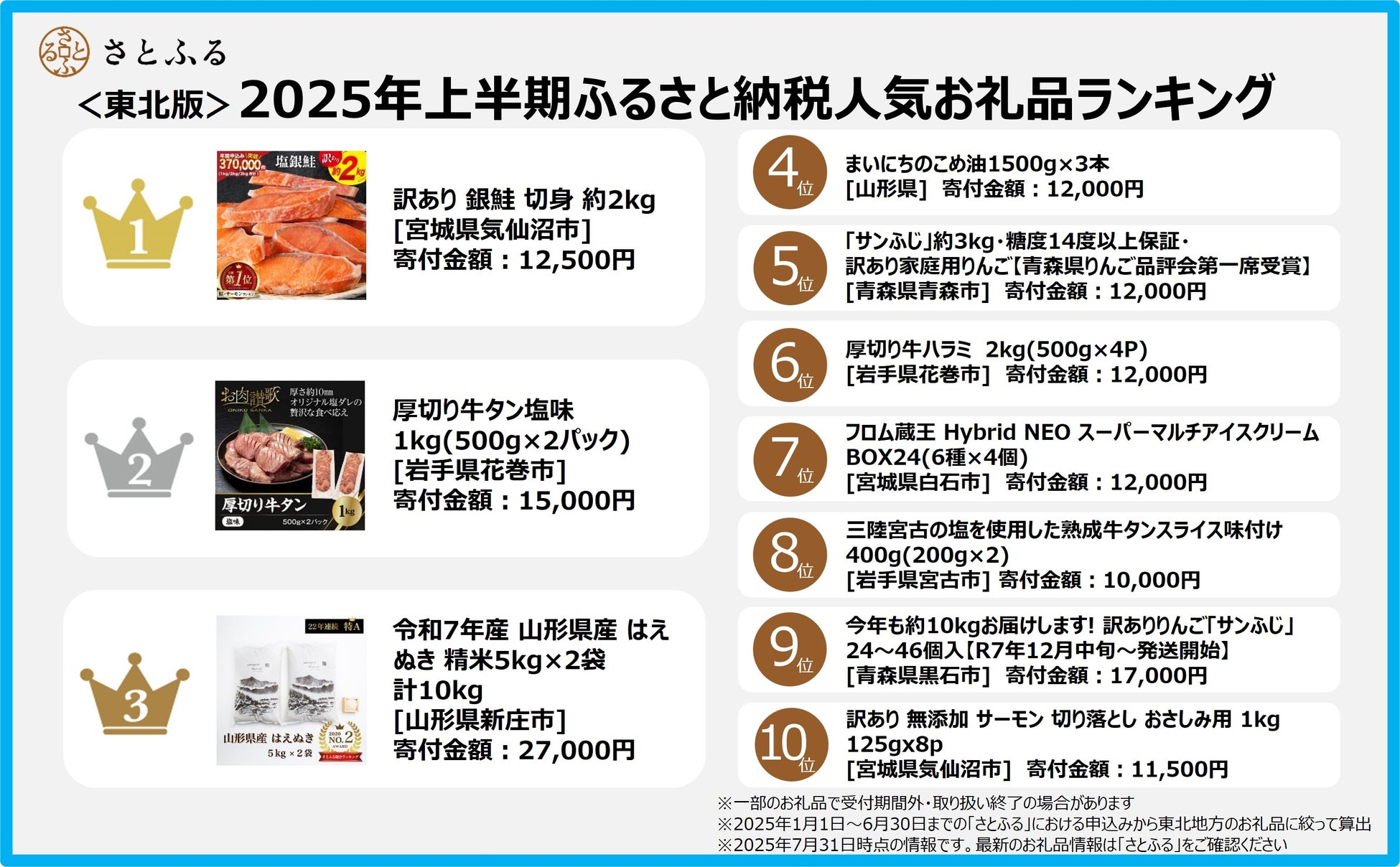 【さとふるニュースレター】<東北版>2025年上半期ふるさと納税人気お礼品ランキング根強い人気のお礼品がランキング上位を占める結果に物価高の影響を受け「訳あり」お礼品が4件ランクイン