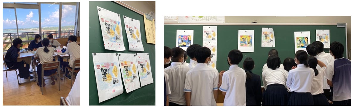 開発にあたり全6回の授業を実施。カルビー社員は5回の直接訪問と1回のオンライン授業を行い、生徒たちと味付けや味名、パッケージデザインを考えました。味付けは特産品「アーサ」と組み合わせる味をグループにわかれて検討し、その中から「島とうがらし」「そばだし」の2つの味付けをカルビーが試作。生徒たちが実際に試食し、最も相性がよい味として沖縄伝統の「そば」を選定しました。おいしさを伝えるために、沖縄の方言で「とてもおいしい」を意味する「でーじまーさん」を味名に使用することも決めました。パッケージは生徒たちのアイデアをもとにカルビーが3つのデザインを試作し、最終的なデザインを投票で決定しました。