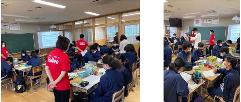 カルビー社員がうんな中学校に訪問し、生徒たちに商品開発や販促方法についてレクチャーしました。