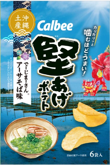 ●『堅あげポテト でーじまーさんアーサそば味』は、恩納村産の「アーサ」を100%使用し、恩納村立うんな中学校3年C組の生徒たちと共同開発した沖縄土産の「堅あげポテト」です。