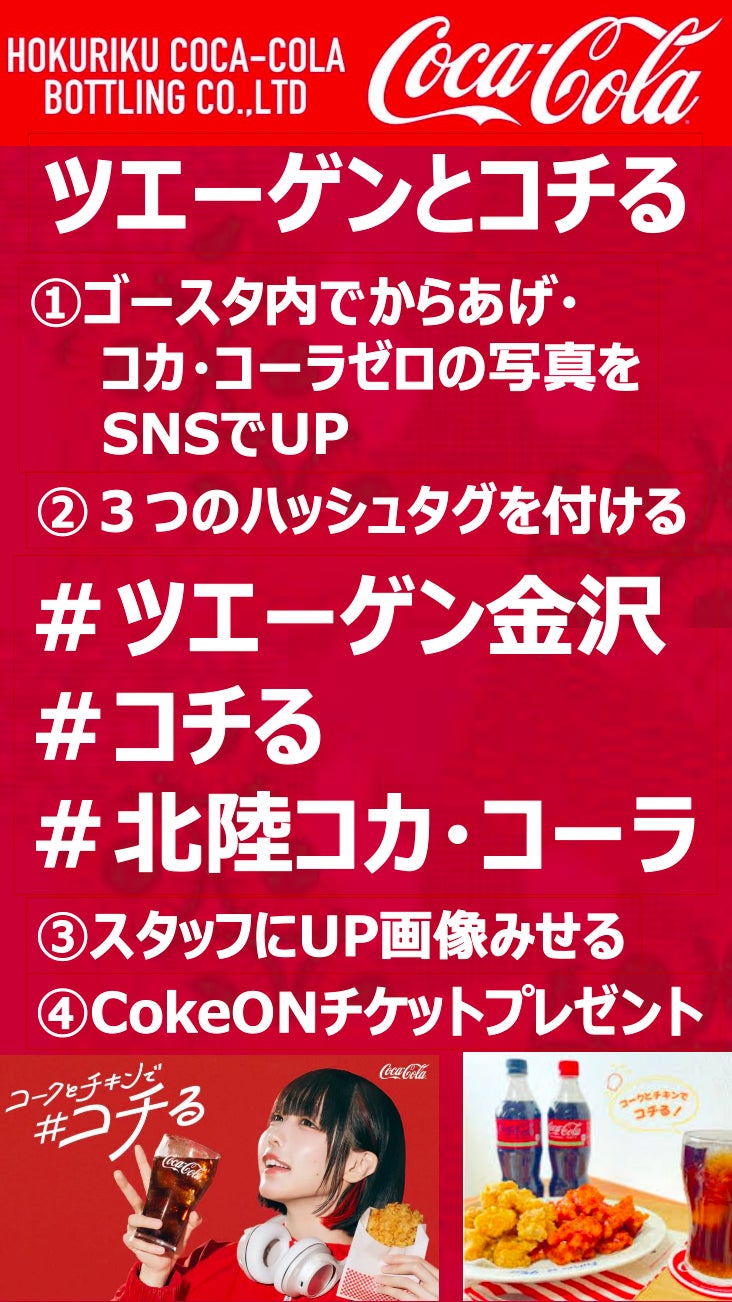 試合当日ご自身のSNSアカウントにて、スタジアムを背景にコカ・コーラゼロとからあげの写真を撮影し、ハッシュタグ「#ツエーゲン金沢#コチる#北陸コカ・コーラ」の3つのハッシュタグをつけて投稿いただいた方にCokeONチケットもプレゼント!