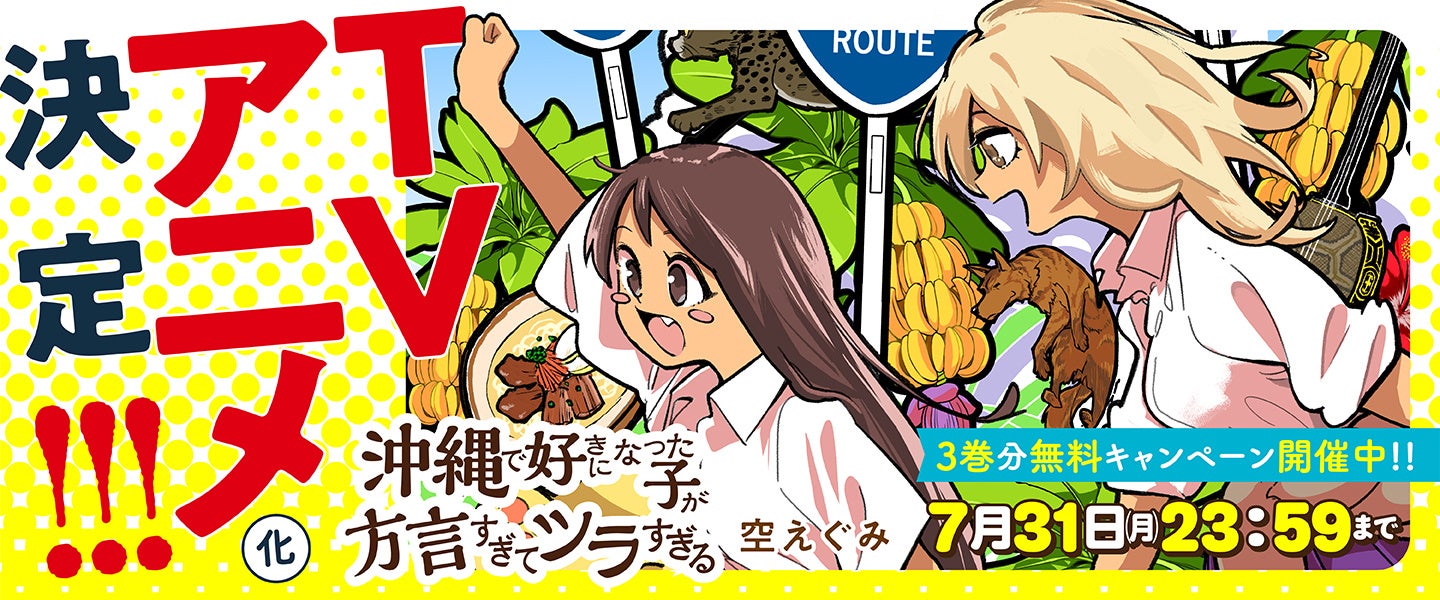 アニメ化を記念して、くらげバンチでは7月31日まで『沖縄を好きになった子が方言すぎてツラすぎる』3巻分無料公開キャンペーンを開催しています。