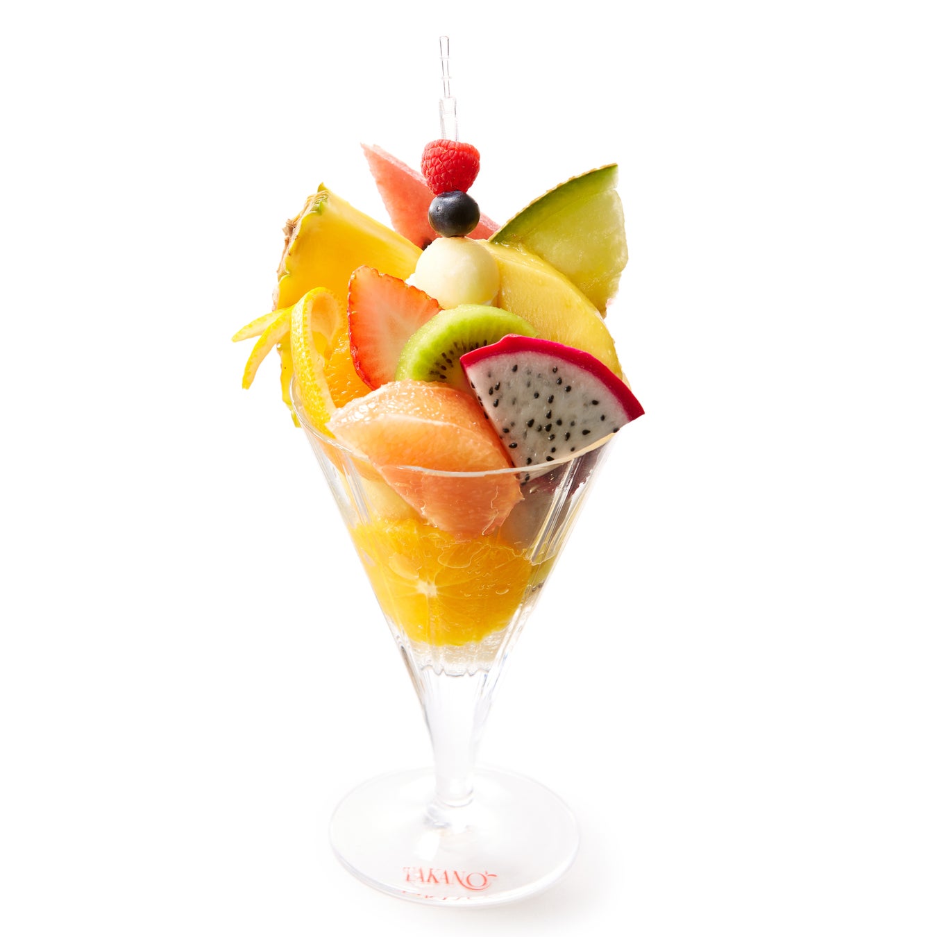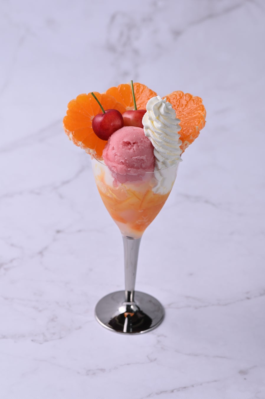 自家製のシャーベット2種類とバニラアイスもグラスに盛り込み、グラスの底にさっぱりとしたコアントローゼリーをしのばせています。