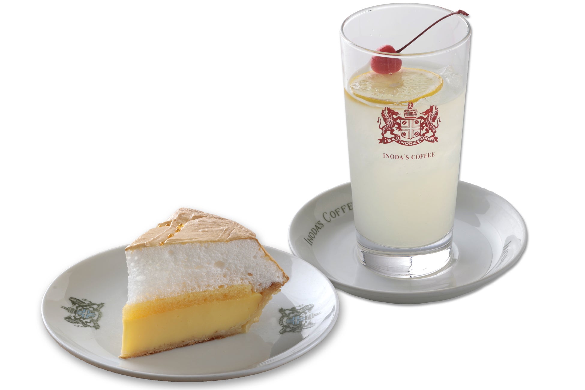 イノダ定番のレモンパイ。白いメレンゲとレモンの風味がきいたカスタードクリームがマッチしています。 レトロな見た目のレモンスカッシュとともに、爽やかなひと時をお楽しみください。