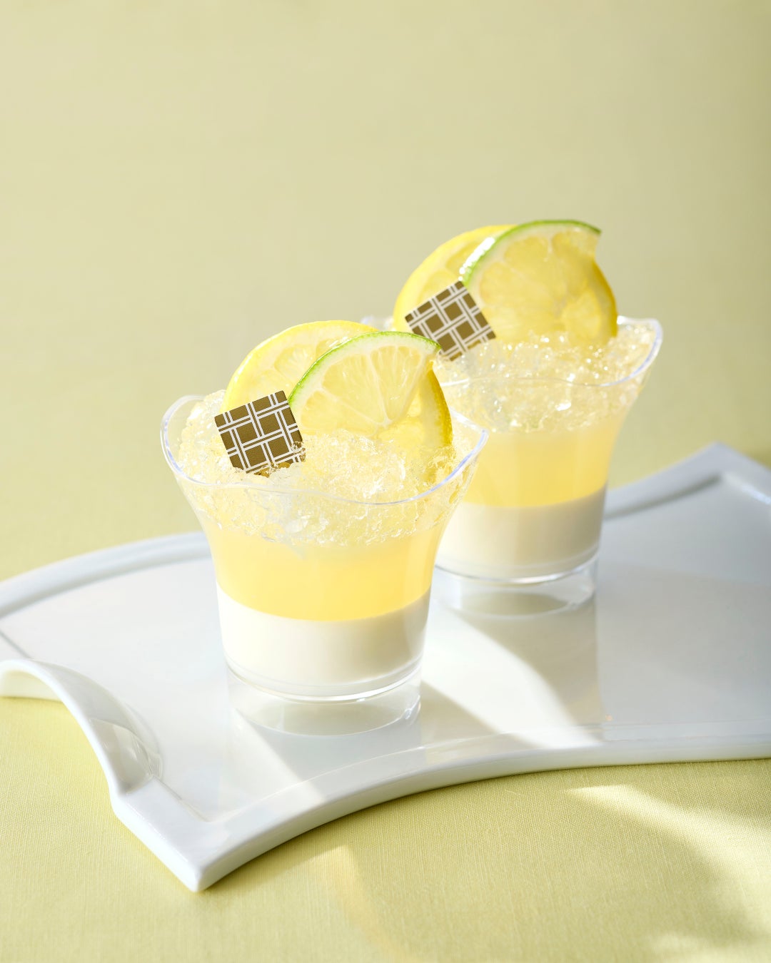 杏仁風味のミルクゼリーと、夏らしい爽やかなレモンゼリーを合わせました。