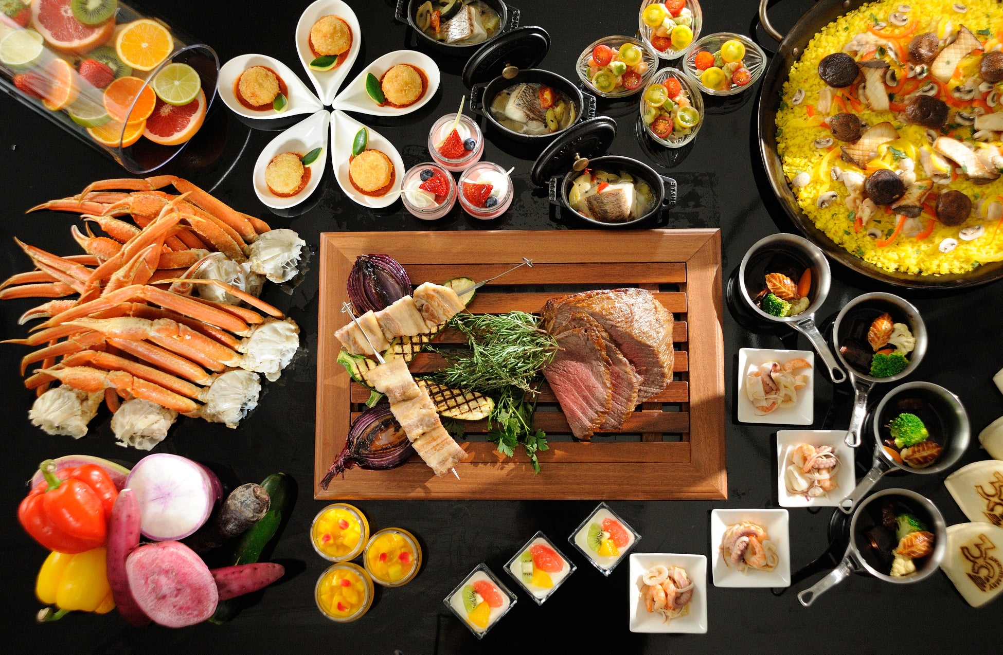 シェフが目の前で焼き上げるステーキや、職人が握るお寿司、そして冬に嬉しい蟹の食べ放題など、ホテルならではの上質な味をブッフェスタイルで。出来立ての香ばしい香りとともに、臨場感あふれる食のエンターテインメントをお届けいたします。また、ビンチョウマグロの韓国風サラダ、魚介のスパイシーマリネ 地中海風、豚の角煮で作る台湾式ハンバーガー『刈包 ~グアバオ~』など、各国のお料理を一つの会場でお楽しみいただけます。