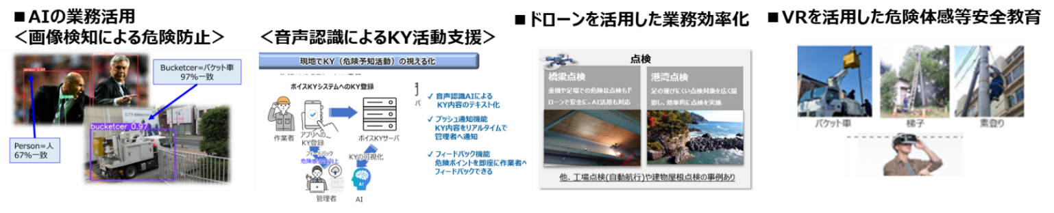 · 現場作業DX :AI(画像検知・音声認識)、ドローンの業務活用、VRによる安全研修