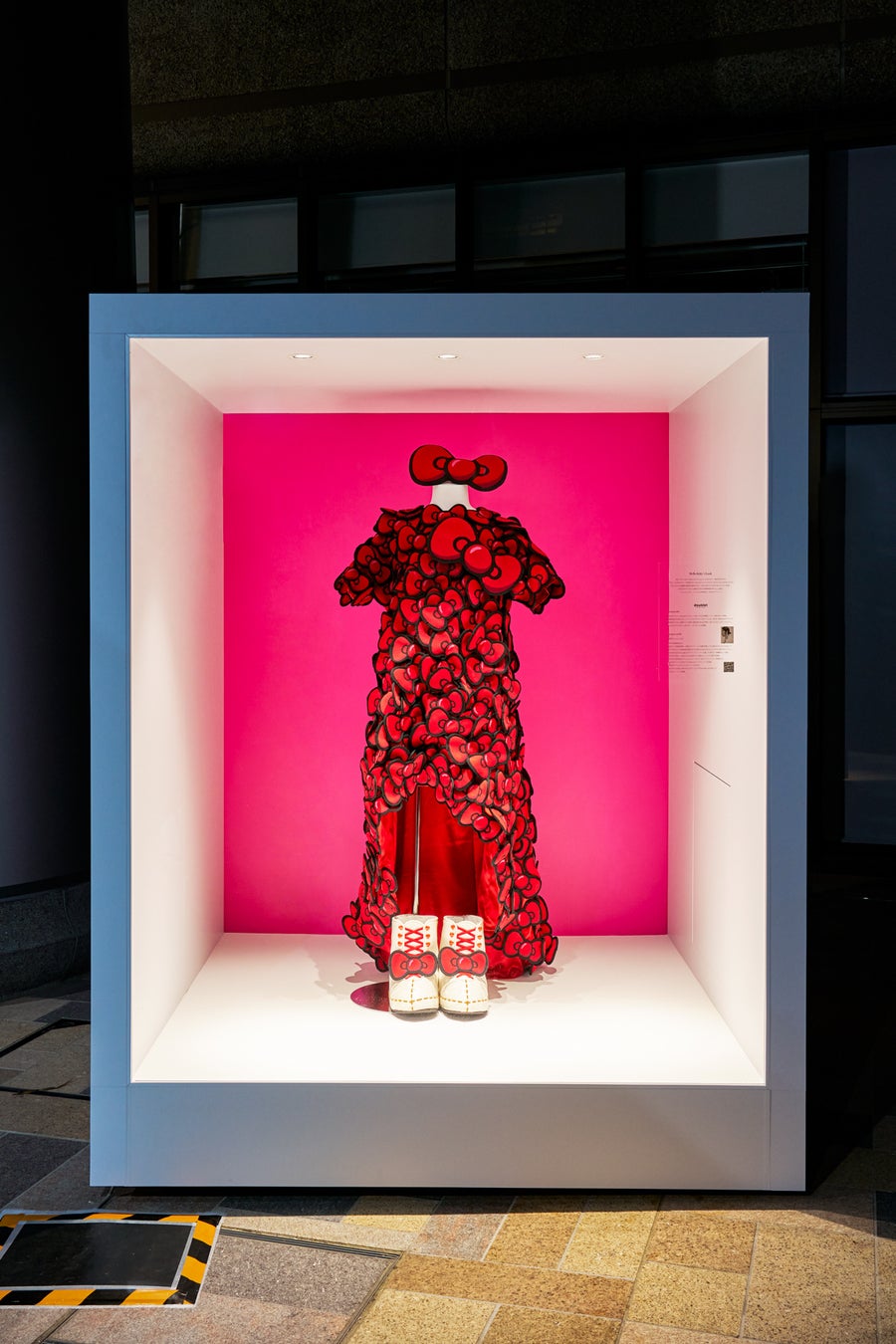 「THE ONES TO WATCH 2024」受賞者のハローキティが『VOGUE JAPAN』の撮影で着用した衣装が特別に展示されました。doubletによるデザインで、赤いニットの2Dリボンが300個あしらわれた世界に一着だけのオートクチュールドレスです。