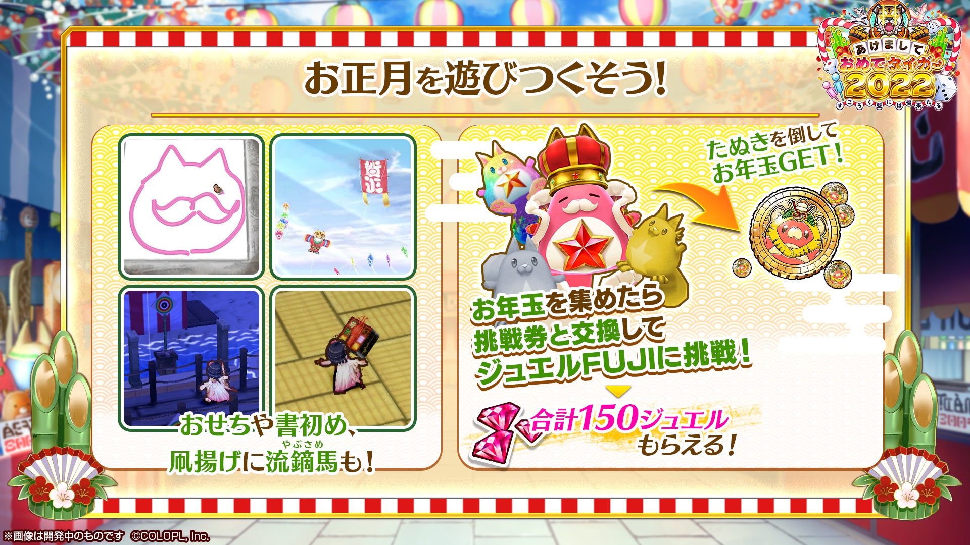 クエストでは、「福笑い」や「書初め」、「凧揚げ」などのお正月にちなんだ遊びを体験できるものや、大量のジュエルをゲットできる「ジュエルFUJI」に挑戦することができます。