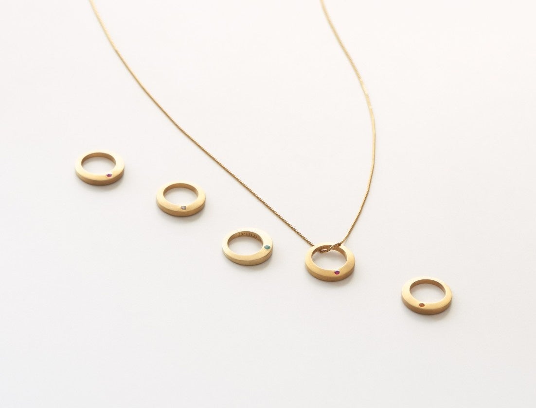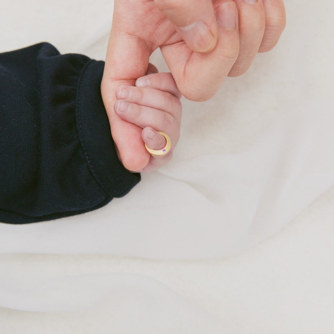 赤ちゃんと記念撮影したり、母親や父親がネックレスに通して身につけたり、子どもが大きくなった時にプレゼントするなど。赤ちゃんが健やかに成長し幸せでいられますように、ベビーリングに願いを込めました。ベビーリングは、星座石をセレクトし、内側にお名前や誕生日も刻印いただけます。