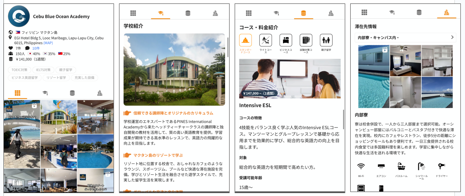 ネイティブキャンプ留学では、ユーザーが必要な情報を分かりやすく把握できるよう、常に丁寧で明確な情報提供を心がけています。Cebu Blue Ocean Academyの詳細情報は、以下の4つのカテゴリーに分けて掲載しており、知りたい情報を的確にお届けします。