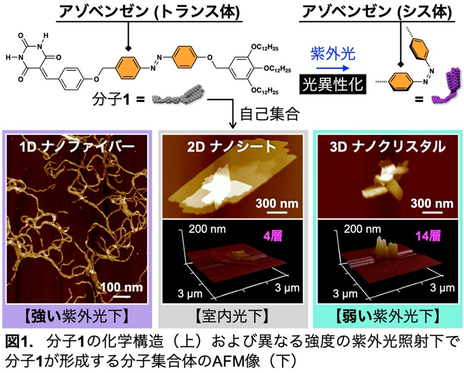 研究チームは、フォトクロミック分子の構造変化(光異性化(注4))と、分子集合体の構造多様性(超分子多形(注5))を組み合わせることで、照射する光の強度によって異なる次元性を持つ3種類の集合構造(一次元ナノファイバー、二次元ナノシート、および三次元ナノクリスタル)を作り分けることに成功しました(図1)。