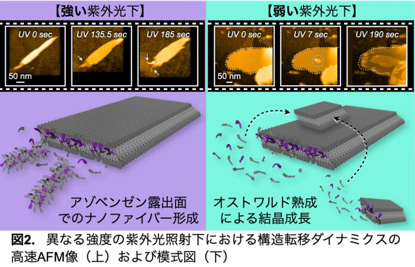 光による構造変化のメカニズムを詳しく調べるために、研究チームはナノレベルの構造変化を高速で捉えることができる高速AFMを利用しました。強い紫外光を照射すると、「二次元ナノシート → 一次元ナノファイバー」への変化が、ナノシートの特定の辺から選択的に進行する様子が観察されました(動画1および図2左、© 2025 Tamaki et al. / Chem (Cell Press) 掲載論文より引用)。さらに分子1の単結晶構造解析にも成功し、結晶構造とナノシートを比較することで、アゾベンゼン部位が露出していて光異性化の影響を強く受けやすい辺から分子が構造変化するというメカニズムを明らかにしました。一方、弱い紫外光照射では、「二次元ナノシート → 三次元ナノクリスタル」への変化が起こるナノシートと、消滅するナノシートの両方が観察され、「"光誘起"オストワルド熟成(注6)」が進行することが明らかになりました(動画2および図2右、© 2025 Tamaki et al. / Chem (Cell Press) 掲載論文より引用)。