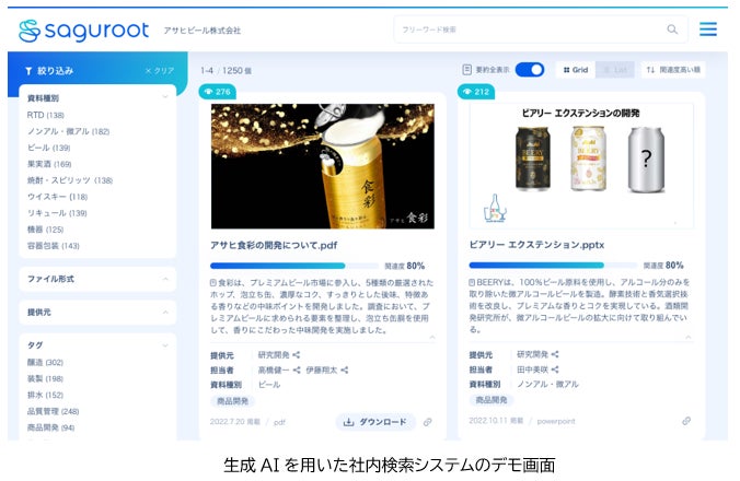 本システムは、丹青社が開発したシステム「saguroot」をもとにしており、社内で保有する膨大な資料やデータを一括で検索することができます。さらに、生成AIを活用することで検索だけでなく、要約された状態で情報を確認できます。