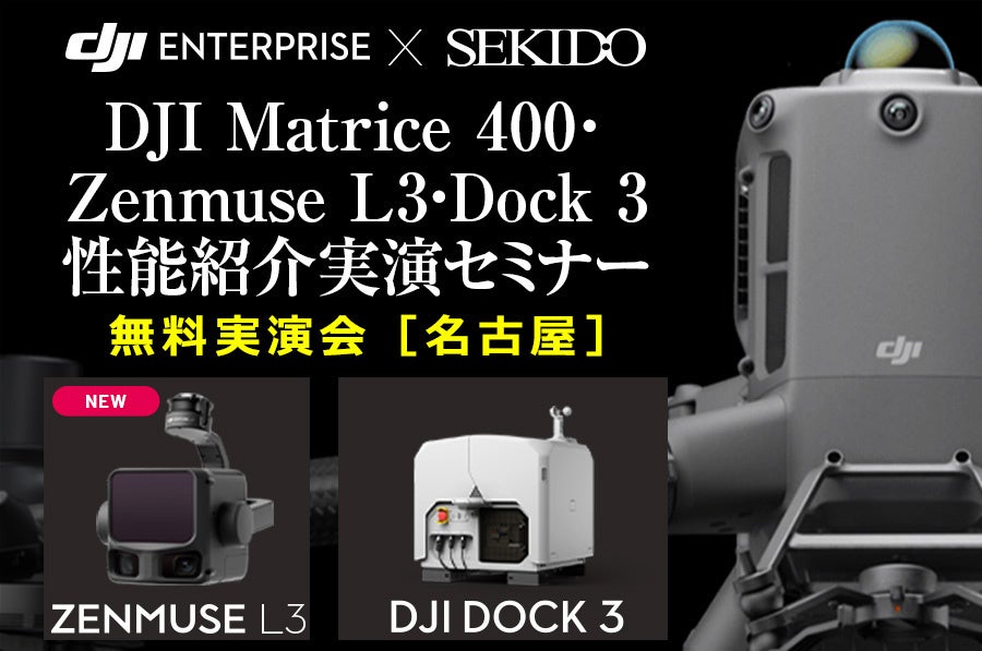 DJI(ディージェイアイ)正規販売代理店としてドローンビジネスの最前線を支える株式会社セキド(本社:東京都港区、代表取締役:大下貴之、以下「セキド」)は、株式会社アルマダス(本社:愛知県豊橋市、代表取締役:吉田泰行)と共催で、2025年12月11日(木)13時より愛知県名古屋市にて、産業用フラッグシップドローン「DJI MATRICE(マトリス) 400」と最新LiDARモジュール「DJI ZENMUSE(ゼンミューズ) L3」などの測量向けドローンの無料説明会「DJI Matrice 400・Zenmuse L3・Dock 3 性能紹介実演セミナー」を開催いたします。