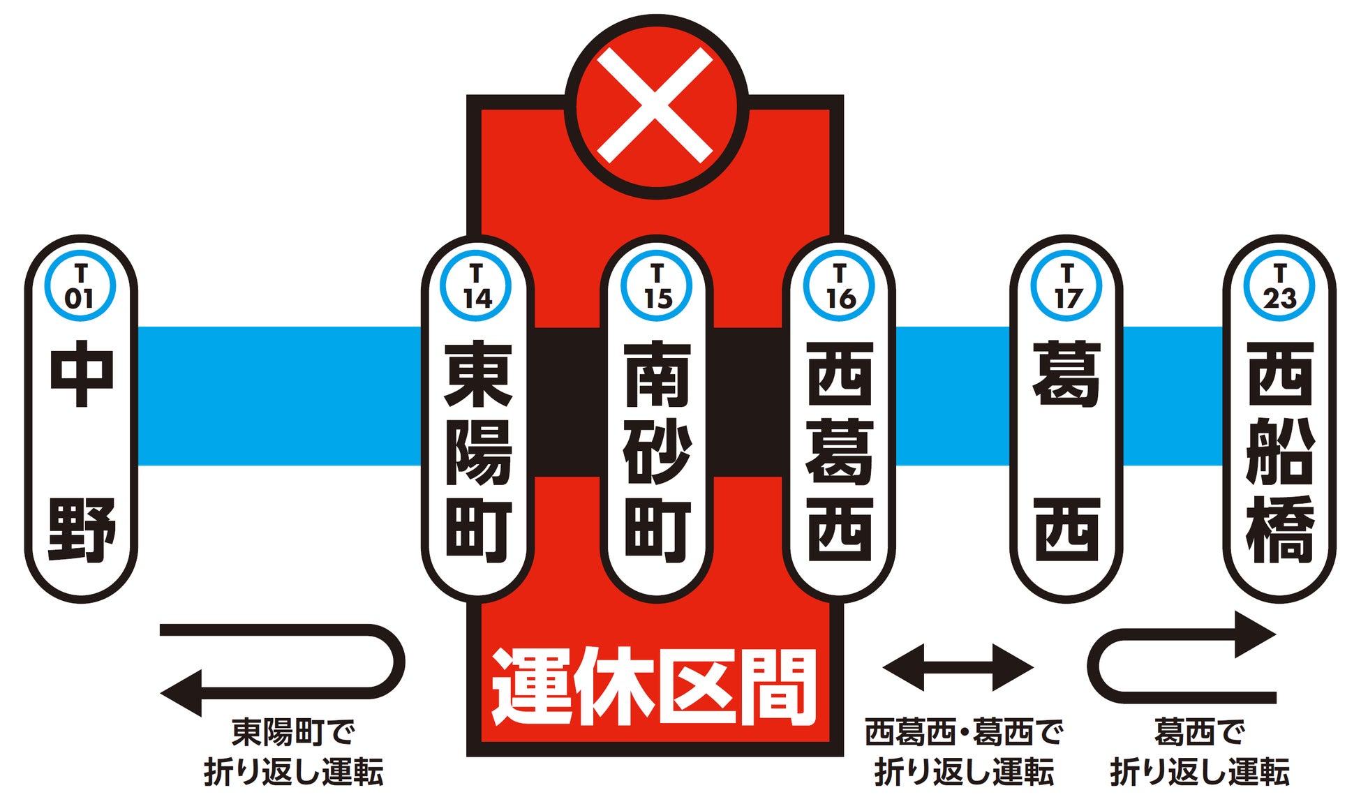 工事期間中、東西線は東陽町~西葛西駅間で終日運休するため、東陽町駅及び葛西駅での折返し運転を実施します。また、西葛西~葛西駅間は、同区間での折返し運転を行うため葛西駅でのお乗り換えが発生します。