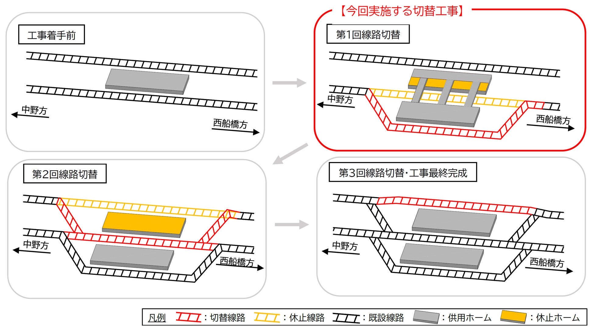 線路とホームの増設は工事最終完成までに、合計3回の線路切替工事を予定しています。
