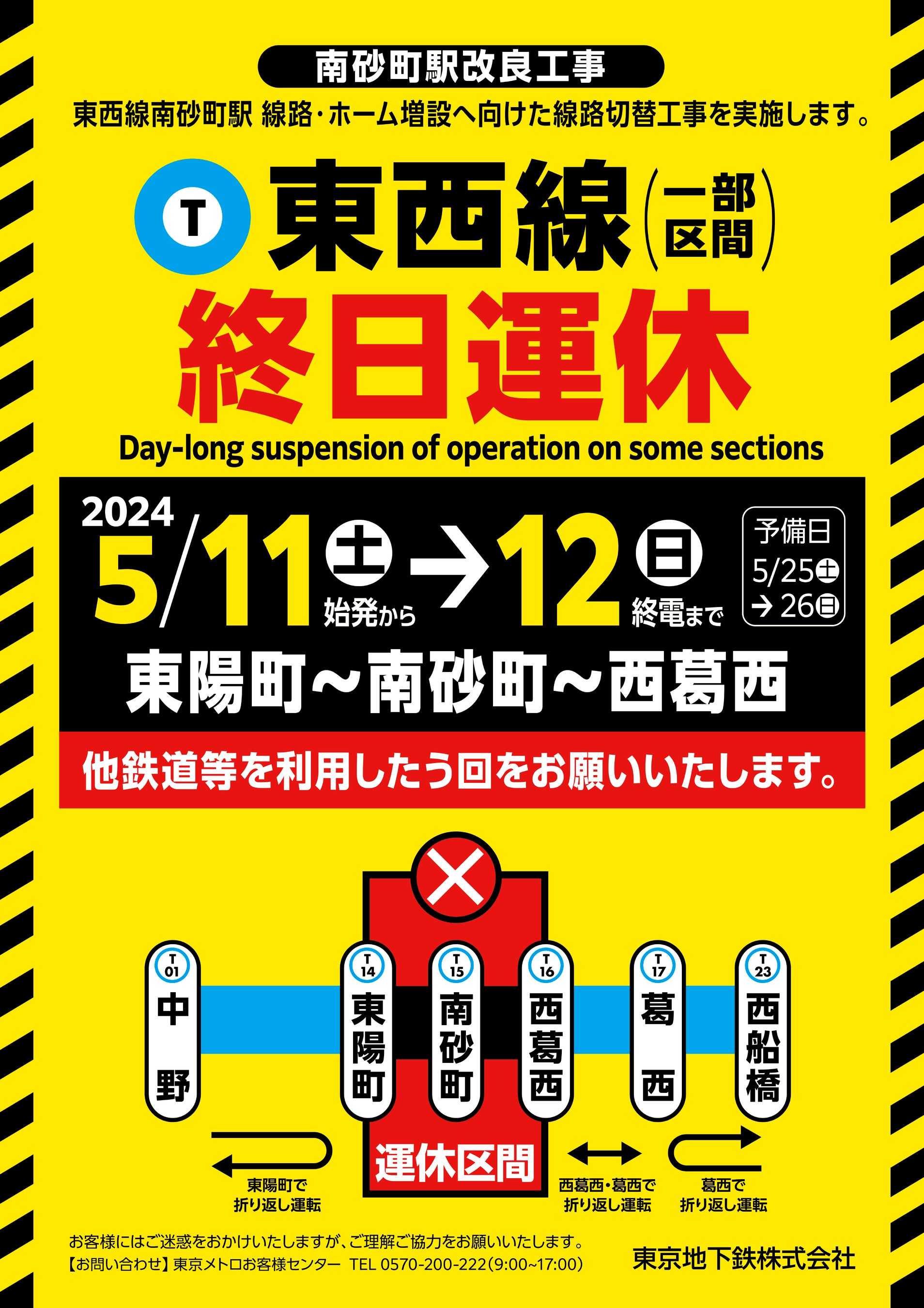 ・東西線沿線でのイベント開催等を計画されている場合は、2日間の終日運休に伴い、他鉄道等を利用したう回により通常よりも移動に時間がかかることを考慮いただきますようお願いいたします。