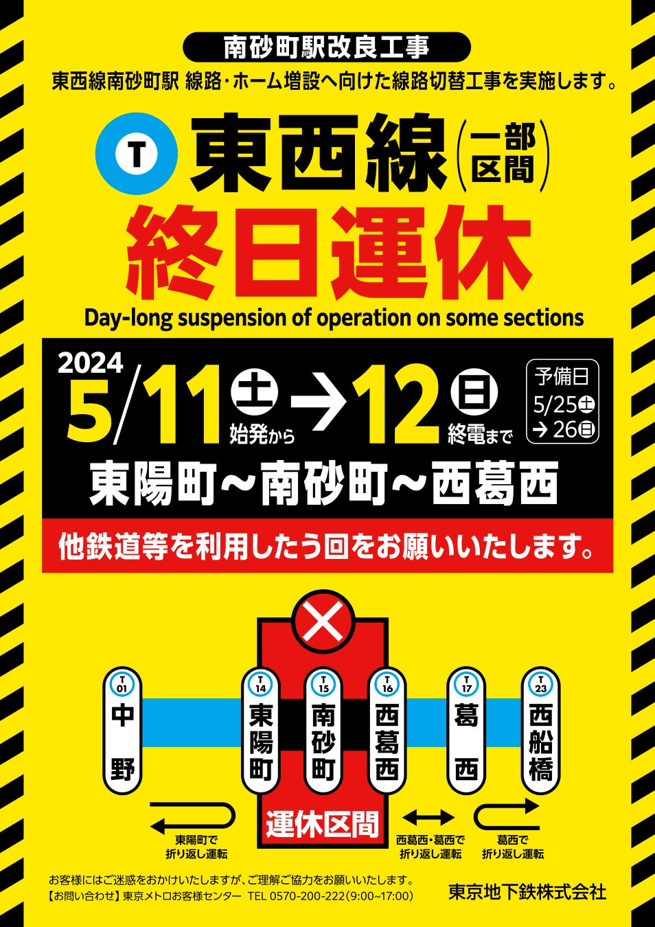 東西線南砂町駅線路・ホーム増設へ向けた線路切替工事のため、東西線 東陽町~西葛西駅間を運休します