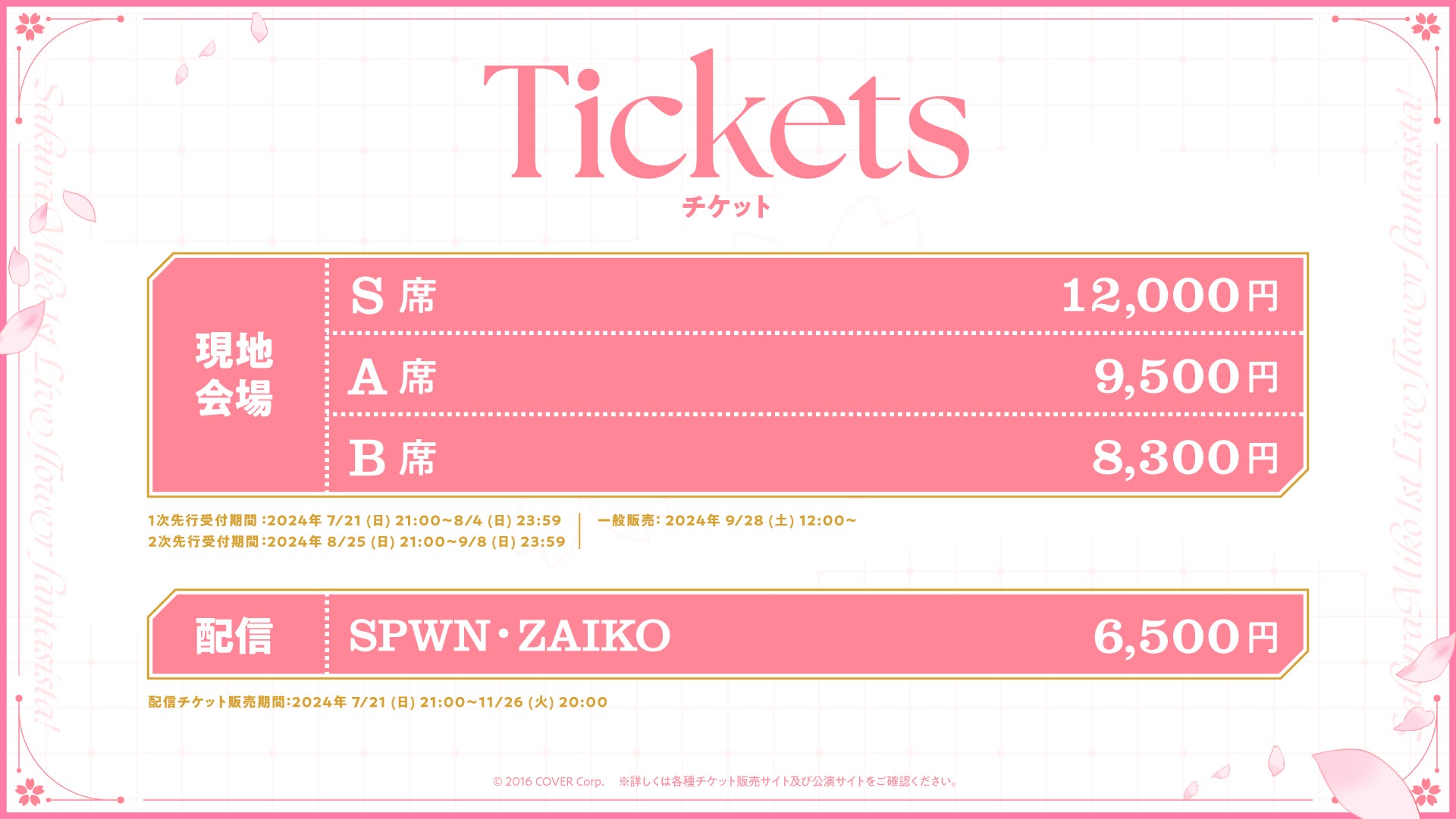 本ライブは、「ホロライブ」所属「さくらみこ」の1stソロライブです。なお、本日7月21日(日)より「SPWN」「ZAIKO」にて配信チケットの販売が開始すると共に、現地会場指定席チケットの1次先行(抽選)も開始いたしました。