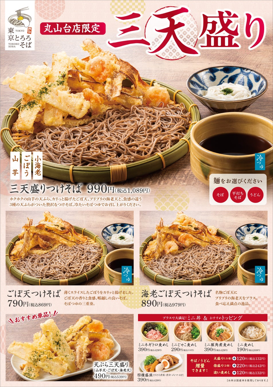 日々の活力になる創作そばが選べる「東京とろろそば」横浜丸山台店にて2025年4月9日(水)より「三天盛りつけそば」など天盛りメニューの販売を開始いたします。