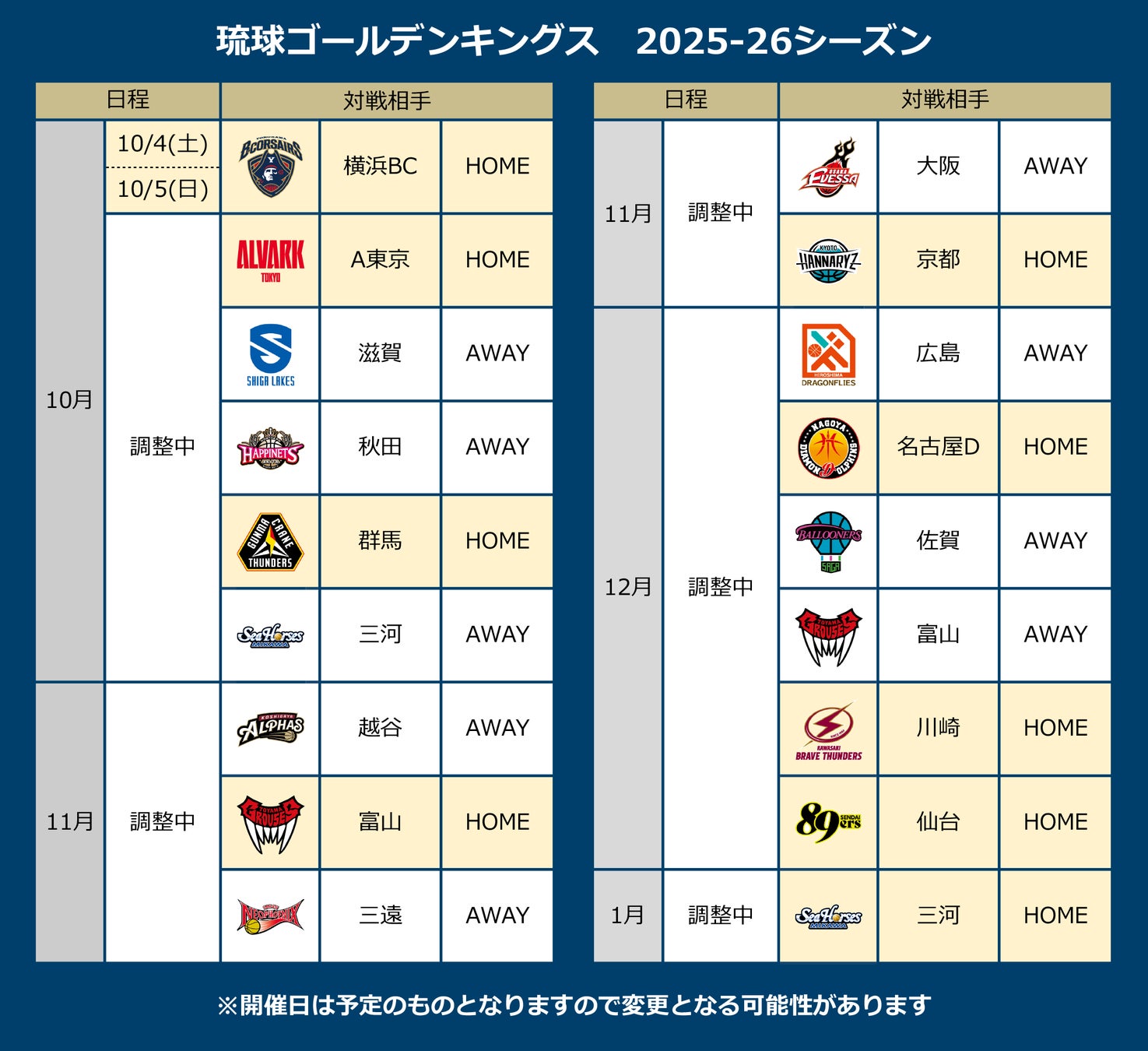 B.LEAGUE 2025-26シーズン開幕カード決定!ホーム開幕は横浜ビー・コルセアーズと対戦!