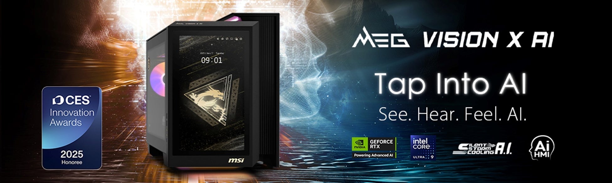 CES 2025 Innovation Awardをダブル受賞したMSI「MEG VISION X AI」ゲーミングデスクトップは、先進のIntel® Core™ Ultraプロセッサー(シリーズ2)と最新のNVIDIA®グラフィックスでパフォーマンスを再定義します。マイクとスピーカーを内蔵した革新的な13インチAI HMIタッチスクリーンは、音声対話をサポートし、シームレスなユーザー効率を実現します。主な機能には、リアルタイムのハードウェア監視、インテリジェントなモード切り替え、MSIゲーミングモニター設定の簡単なコントロールが含まれます。「Silent Storm Cooling AI」により、システムは高度なAIアルゴリズムを使用してファンの回転速度を動的に調整し、静かな動作を維持しながら最高のパフォーマンスを保証します。