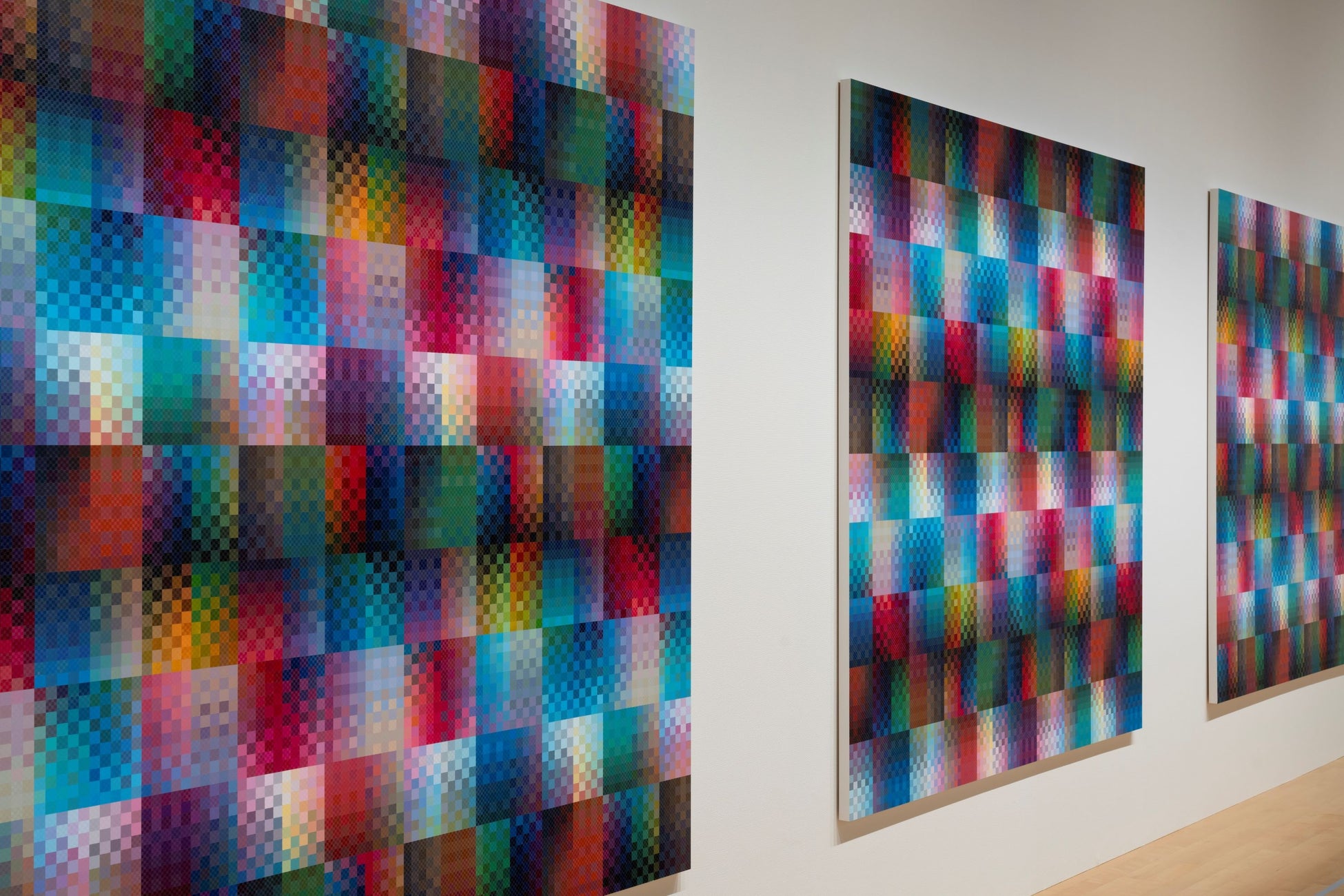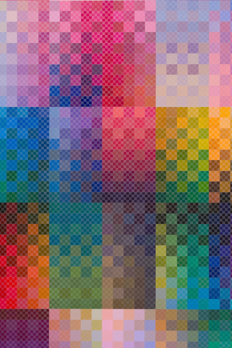 川人綾(かわとあや)は、グリッド状の絵画のなかに「制御とズレ」を表現するアーティストです。京都での学生時代に日本の伝統的な染織を学んだことから、緻密な手作業の過程で否応なく生じる「ズレ」に着目し、そこから生まれる人間の制御を超えた美しさを絵画上で表現しています。また、神経科学者である父の影響もあり、錯視効果がもたらず「ズレ」に注目しています。格子状に鮮やかなグラデーションが広がる作品は、視点によって多様な表情を見せます。4月から始まった大阪・関西万博では、国内外の賓客らをもてなす迎賓館に飾るタペストリーのデザインと制作監修を務めるなど、国内外で注目されています。