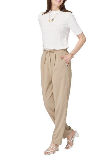 すっきり見えのテーパードシルエット。ウエストを紐で調整できるため、楽な着心地です。Tシャツやニットなど、幅広いコーディネートに合わせやすいアイテムとなっています。