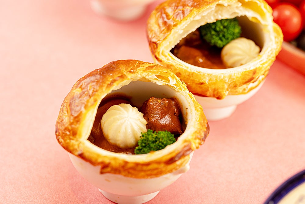 じっくり煮込んだ国産牛を、サクサクのパイ生地で包み込んで焼き上げました。ソースとパイの香ばしさが絶妙にマッチします。