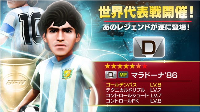 期間中、『BFBチャンピオンズ2.0』の全配信国のユーザーで頂点を争うランキングイベント「世界代表戦」が開催されます。日本国内のライバルと戦う「国内代表戦」、アジアのライバルと戦う「大陸代表戦」を勝ち進み、「世界代表戦」グレードSで上位に入賞した方には、「★7[D] マラドーナ’86」がプレゼントされます。