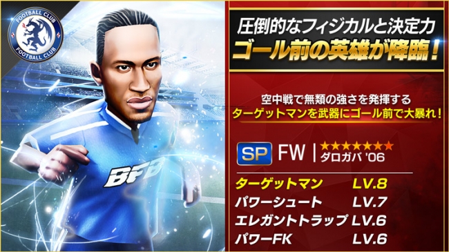 ゴール前でのトラップやシュートで効力を発揮するスキルを備えた「★7[SP] ダロガバ’06」選手が各種「プレミアムスカウト」に新たに登場します。この選手が持つLv.8複合スキル「ターゲットマン」は、「スーパーヘディング」と「ポストプレイ」の効果を合わせもつ強力なスキルです。