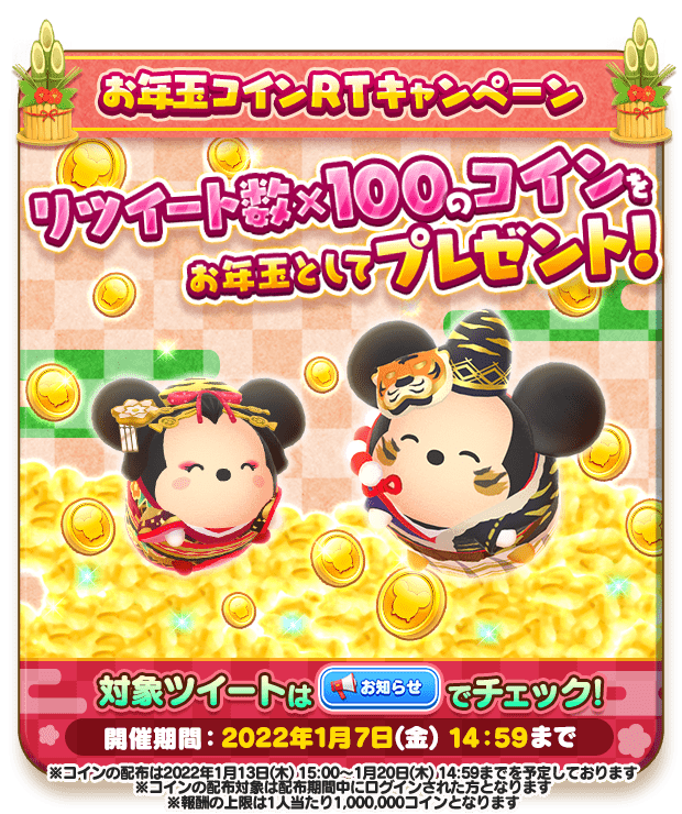期間中に『ツムツムランド』公式Twitter(@tsumland_jp)をフォローし、対象のツイートをリツイートすると、後日RT数×100枚分のコインをお年玉として全員にプレゼントいたしますので、奮ってご参加ください。