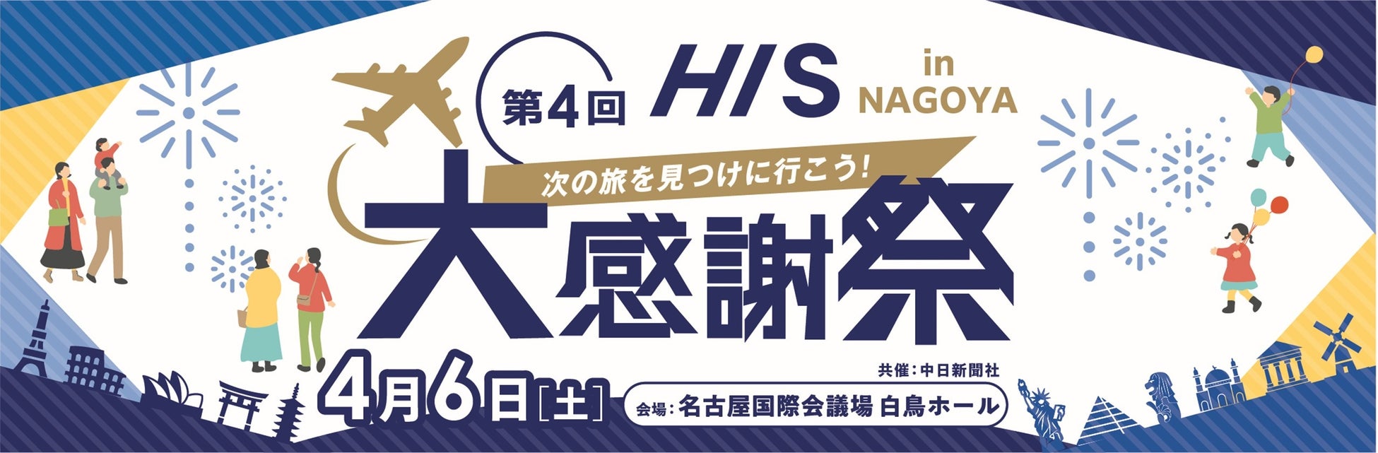 今年2月23日(金・祝)・24日(土)の2日間に渡り東京で開催された第3回「HIS大感謝祭」では、2日間で延べ14,000人のお客様にご参加いただきました。近づくGW、夏休みを前に、次の旅先を検討する場として、第4回目を名古屋で開催することが決まりました。