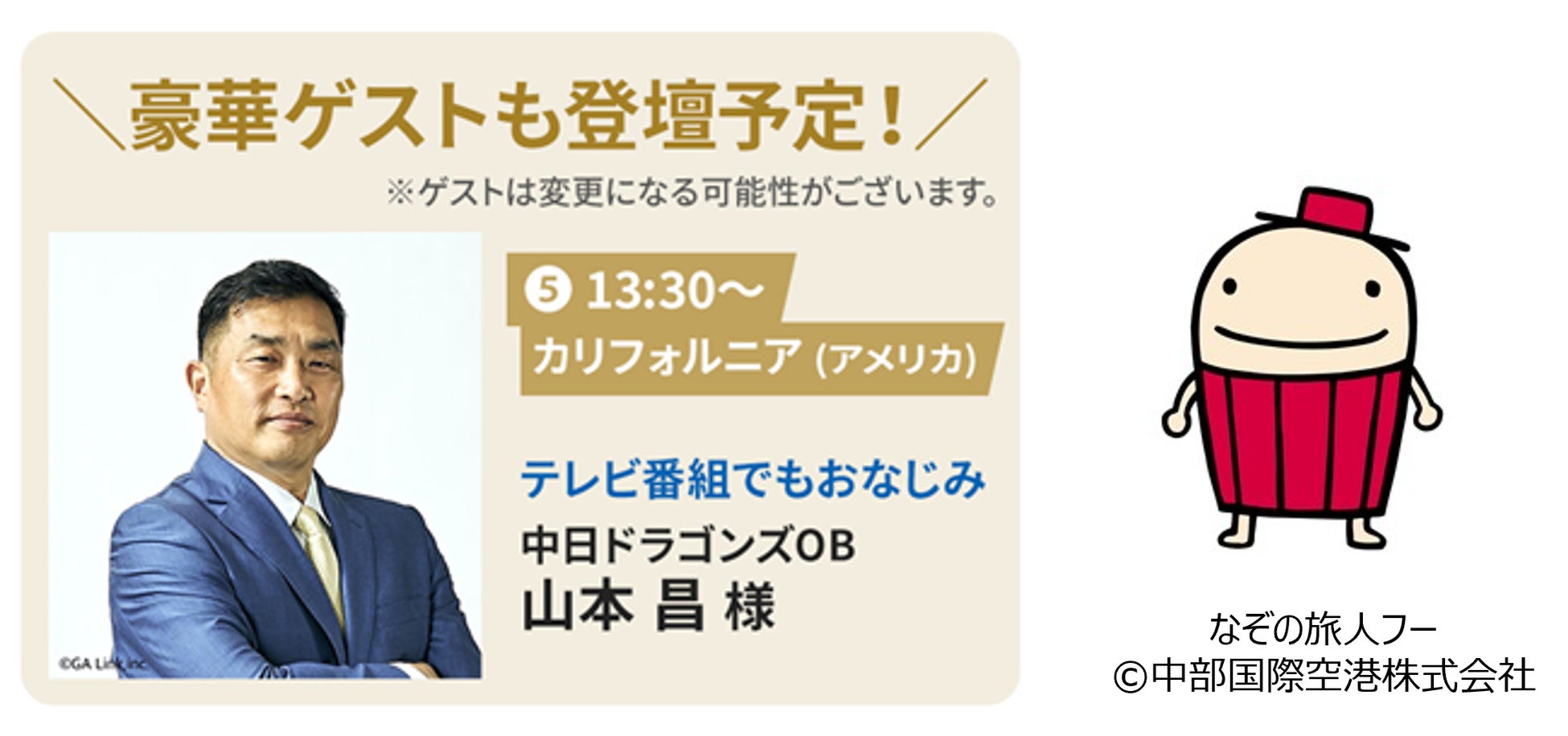 説明会では、それぞれ海外航空券などが当たる「大抽選会」を開催します。抽選会参加には対象回の説明会事前予約が必要です。その他、予約不要の気軽に参加できるミニ説明会や、観光局や航空会社、ホテル、クルーズ会社など23のブース、台湾焼きそば、ベトナム料理のキッチンカーなど、目白押しです。また、昨年に引き続き、セントレアのマスコット「なぞの旅人フー」も来場します。イベント内容の詳細については、順次サイトにて更新予定です。
