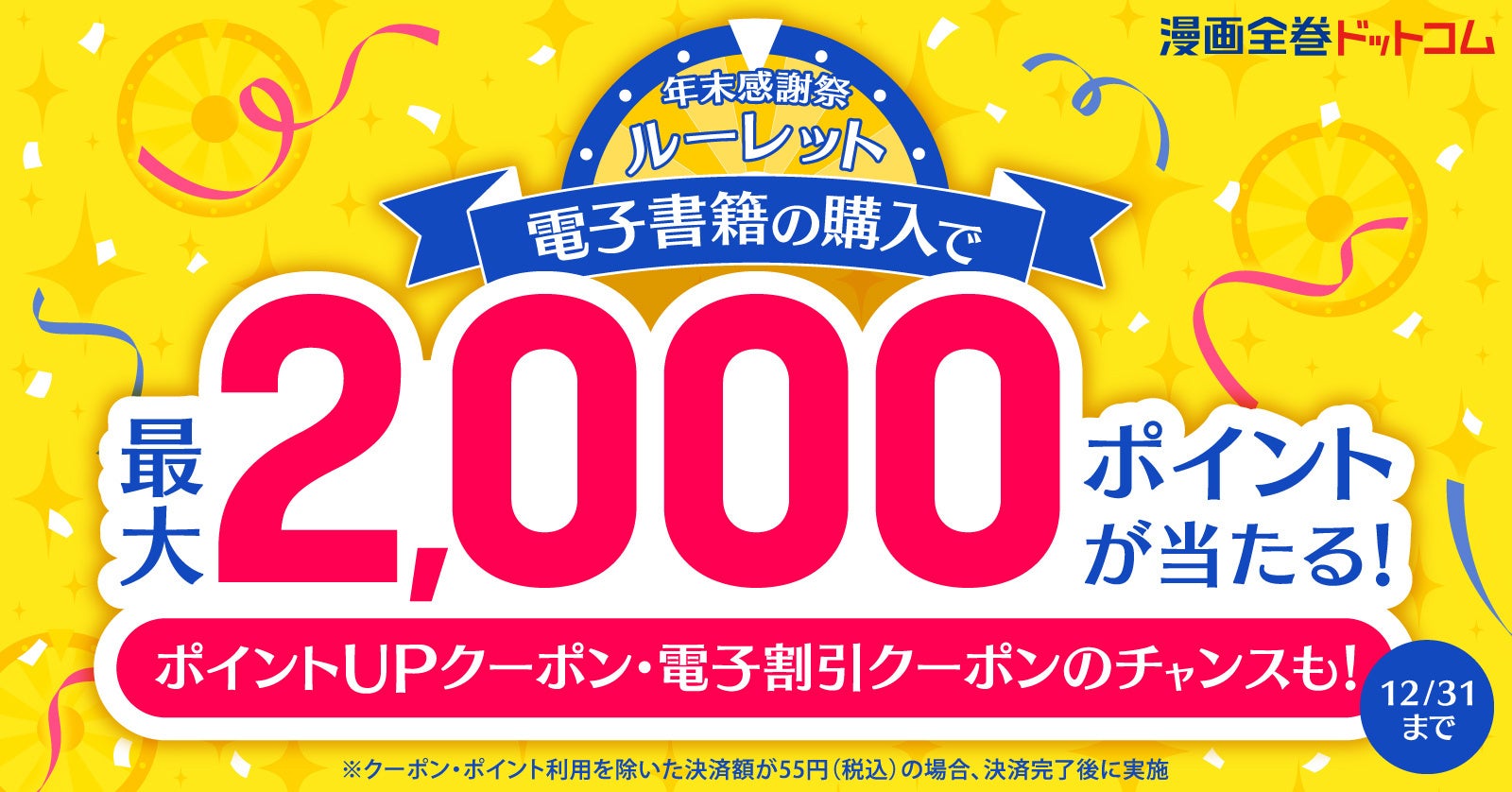 最大2,000円相当★電子書籍の購入完了でポイントが当たるルーレット!年末感謝祭、開催!【漫画全巻ドットコム】