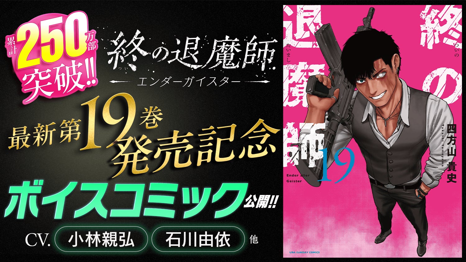 『終の退魔師 ―エンダーガイスター―』は、「川島・山内のマンガ沼」(読売テレビ)や「アメトーーク!」(テレビ朝日)でもおすすめ作品として紹介された、最強の退魔師<エクソシスト>が迫りくる敵をぶっ倒しまくるハリウッド級超爽快アクション漫画で、コミックスの累計部数は250万部を突破しています。