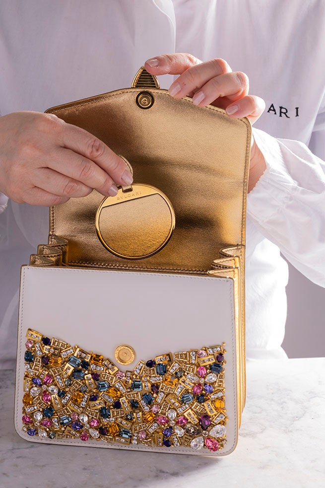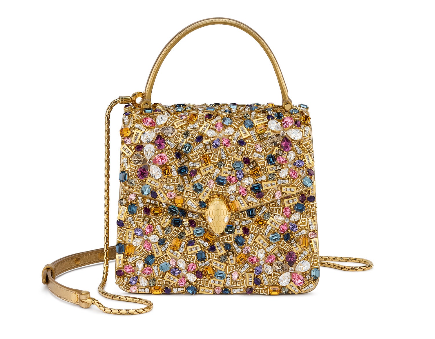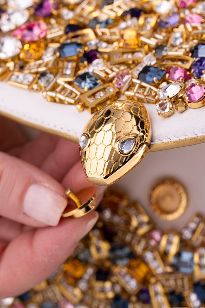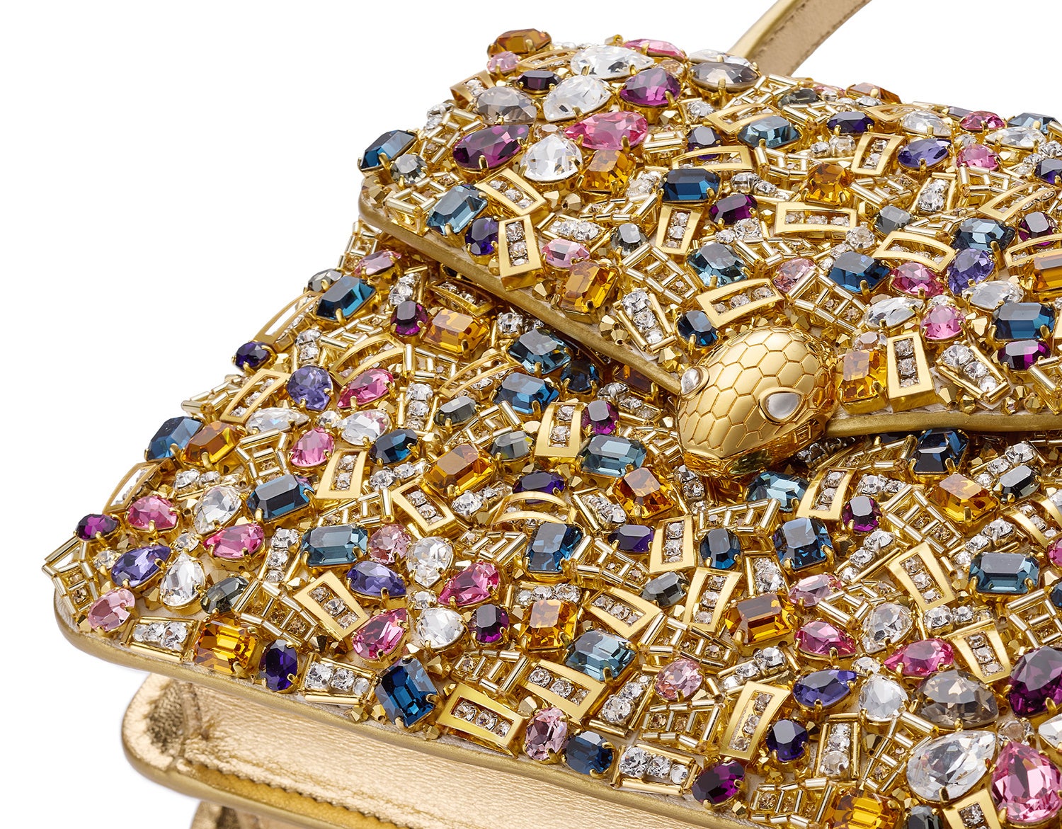 ブルガリ・ヘリテージコレクションに含まれている、2005年に誕生した伝説のネックレスからインスピレーションを得た「セルペンティ オピュレント・ガーデン・オブ・エデン」のバッグは、自然界の最も鮮やかな色をジェムストーンで表現しています。ブルガリの比類なき芸術性と豊かで創造的なレガシーに対する賛歌でもある本バッグには、有名なビブネックレスにも用いられている複雑な職人技が全面に施された見事な刺繍により表現されています。豪華なデコレーションはゴールドのパーツにシトリンやアクアマリン、ピンククォーツ、アメシストなどのカラフルなジェムストーンからインスパイアをうけた美しい色彩の、420個以上のクリスタルや約3,300個のガラスパーツが使用されています。熟練の職人が120時間もの時間をかけて完成させた、色彩、動き、そして類まれなサヴォアフェールが際立つ逸品です。