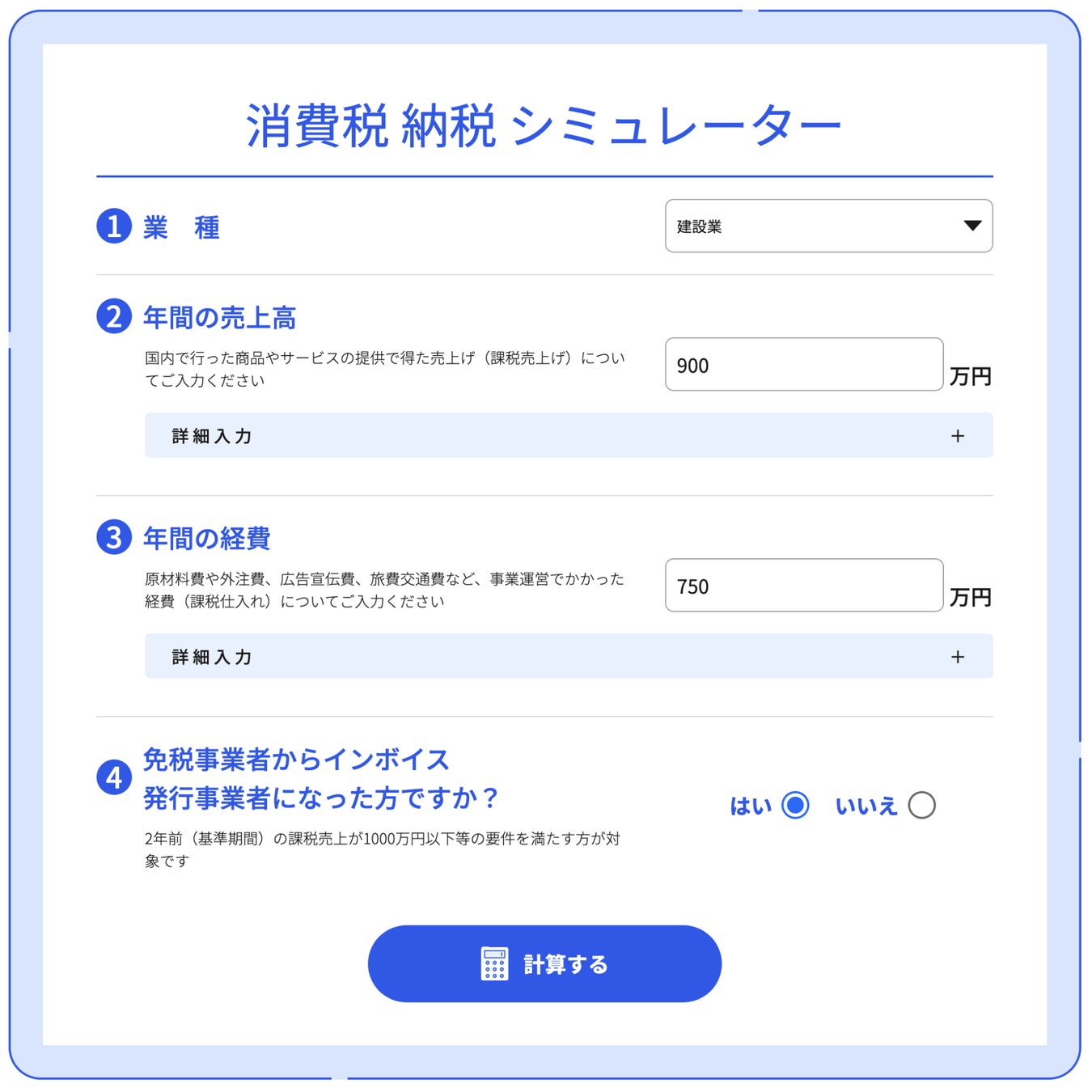 ■2割特例措置にも対応、4つの簡単な質問に回答するだけで納税額をシミュレーション