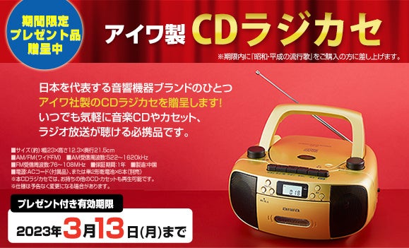 株式会社ユーキャン(東京都新宿区 代表取締役社長:品川 泰一)は、CD全集『昭和・平成の流行歌』の販売を開始しました。発売を記念しまして、3月13日(月)まで期間限定プレゼント「アイワ社製 CDラジカセ」を贈呈いたします。