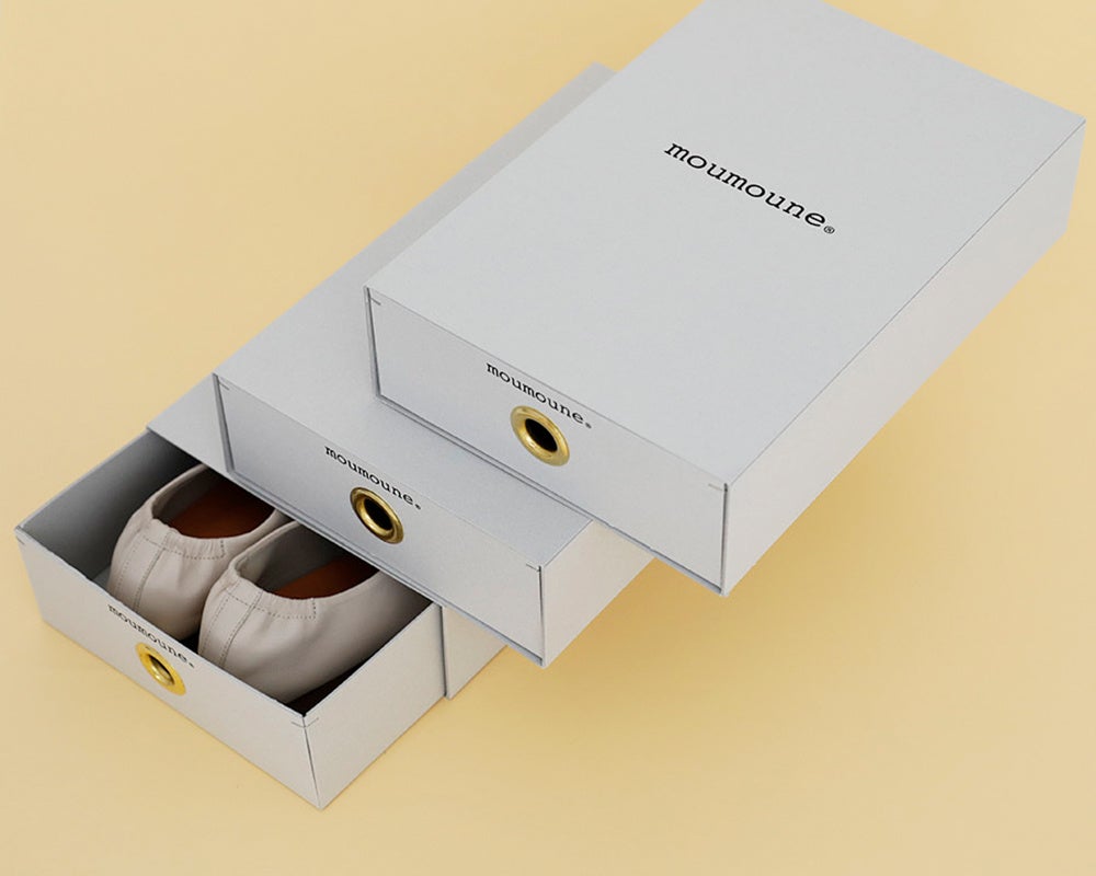 シューズの箱に関して:moumouneでは出来る限り装飾を少なくし、再生紙を使用した箱を使用しております。