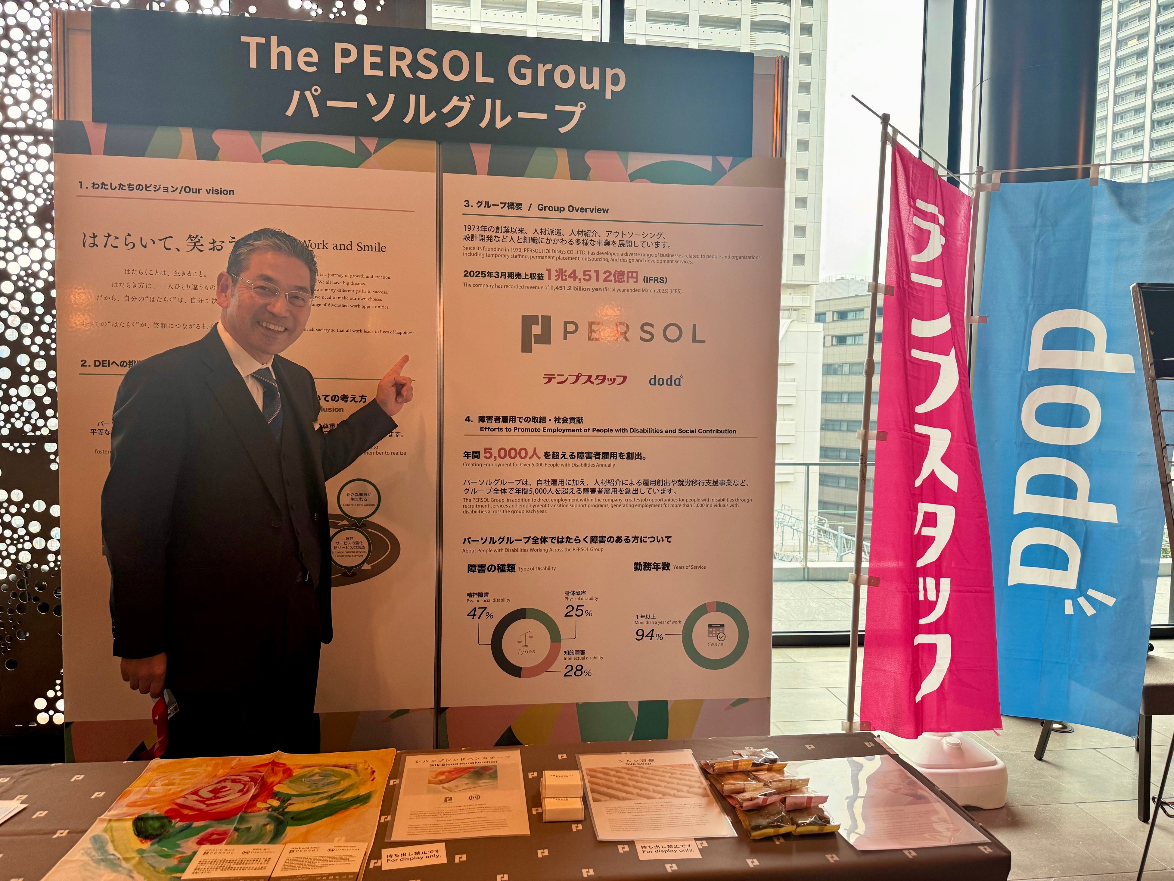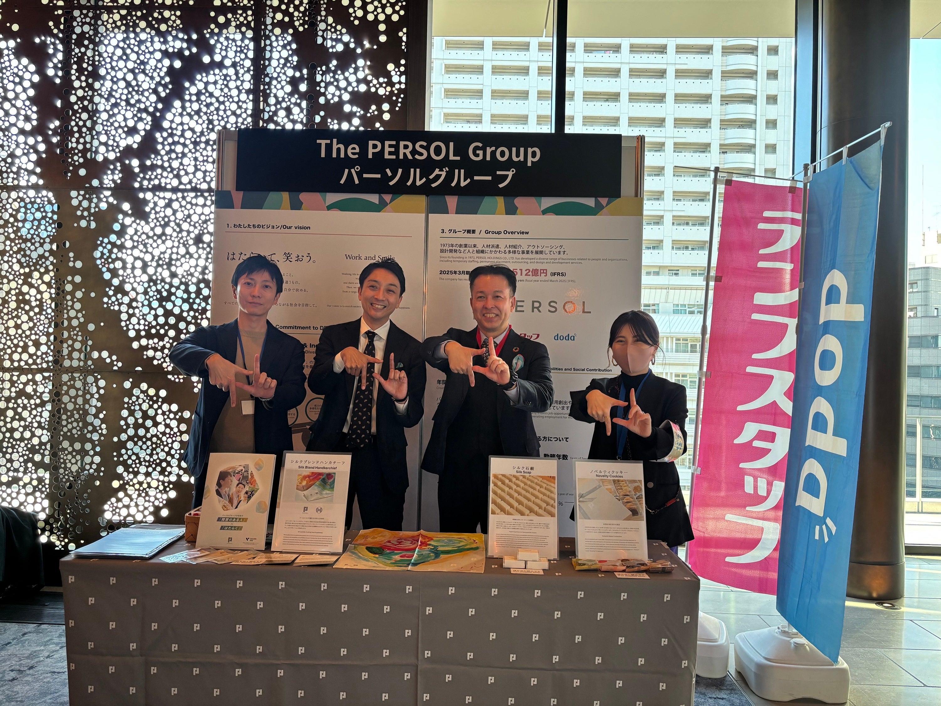 2025年7月、パーソルグループは障害者の活躍推進を目指す国際イニシアティブ「Valuable 500」に加盟しました。さらにこのたび、Valuable500・日本財団・日本経済新聞社が共催し、日本で開催された世界初の障害者インクルージョンに関するサミット「SYNC25 アカウンタビリティ・サミット」にも参加。12月3日(水)~4日(木)の2日間、会場にパーソルグループのブースを出展。DEI(Diversity, Equity & Inclusion)ポリシーや、障害者雇用に関するデータや取り組み、特例子会社のパーソルダイバースで製造しているオリジナルクッキー、シルク石鹸、シルクハンカチなどの展示を行いました。