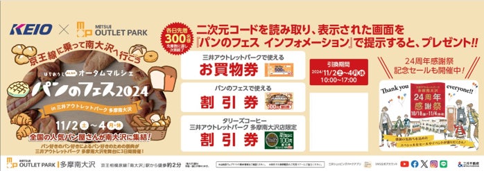 本キャンペーンは、「京王線・井の頭線各駅に掲出する駅ばり、全線の中吊りポスターに記載の二次元コードを読み込んで表示された画面」または「京王アプリ配信投稿に記載のURLからアクセスし表示された画面」(以下、合わせて「読み取り画面」)を「パンのフェス インフォメーション特典引換所」で提示すると、「パンのフェス」で500円(税込み)以上お買上げ時に利用できる100円割引券と、「三井アウトレットパーク」で5,000円(税込み)お買上げごとに利用できる500円お買物券、「TULLY´S COFFEE 三井アウトレットパーク多摩南大沢店」にて店内販売商品お買上げの際に利用できる「100円割引券」の3点を各1枚プレゼントするものです。全国各地の人気パン店が集まるパンのフェスや、アウトレットでのお買物・お食事もおトクにお楽しみいただけます。
