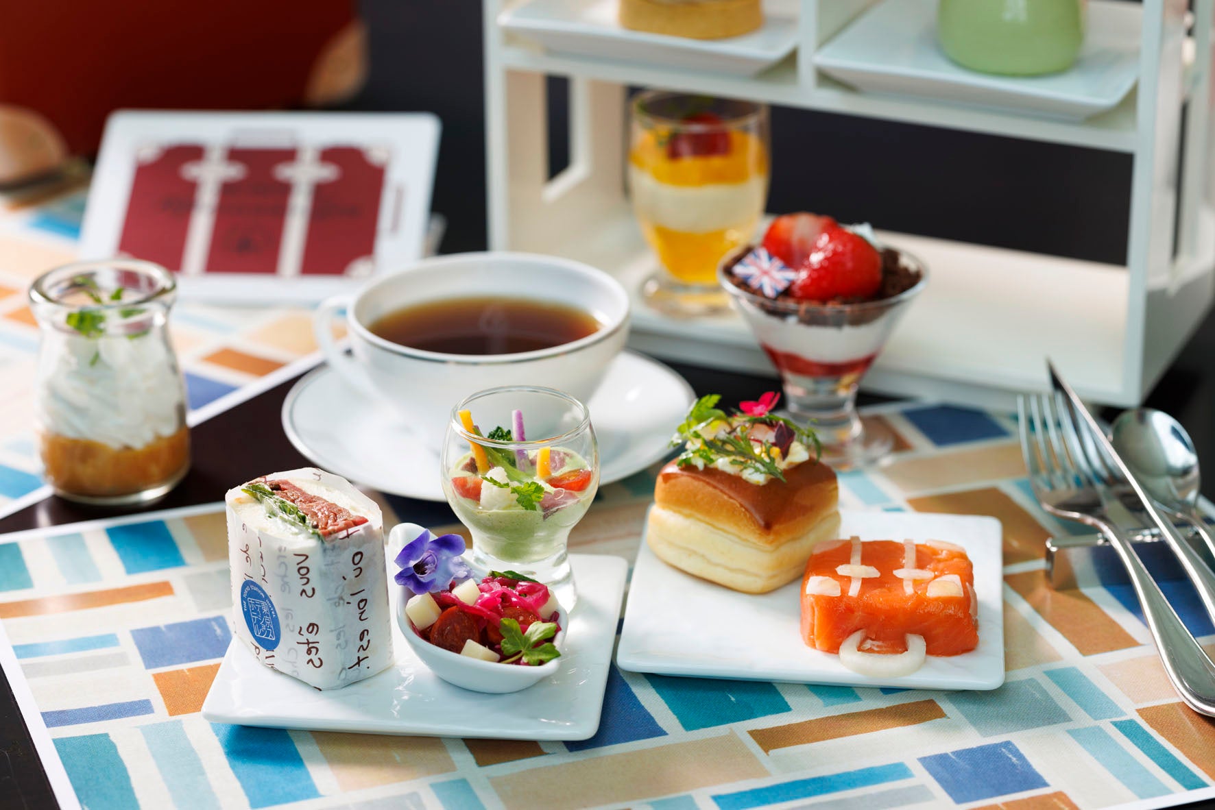 スイーツ7 種、セイボリー5 種の多彩なラインナップは、グローブ・トロッターのスーツケースを模した、愛らしいカシスオペラをはじめ、英国国旗をあしらった3 層のグラスデザート、ジューシーなにんじんシロップのサバランなど、食べるのが惜しいほど見た目も美しいアフタヌーンティーです。お料理とともに英国王室御用達ブランド「フォートナム・アンド・メイソン」を含む12 種ものお飲み物をお好きなだけお楽しみください。