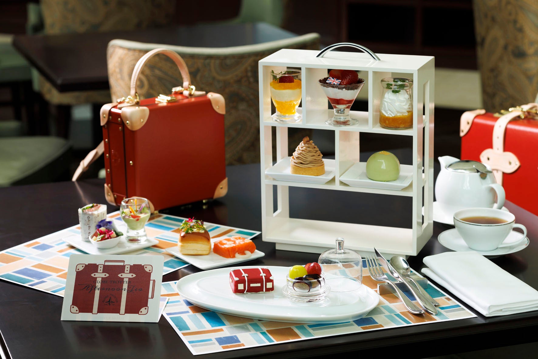 東京ステーションホテルではグローブ・トロッター社製ホテルオリジナルのスーツケースやミニトランクの販売を記念して、クラシックとモダンが同居した優美なデザインの世界観を体験いただける、アフタヌーンティーをご用意いたしました。
